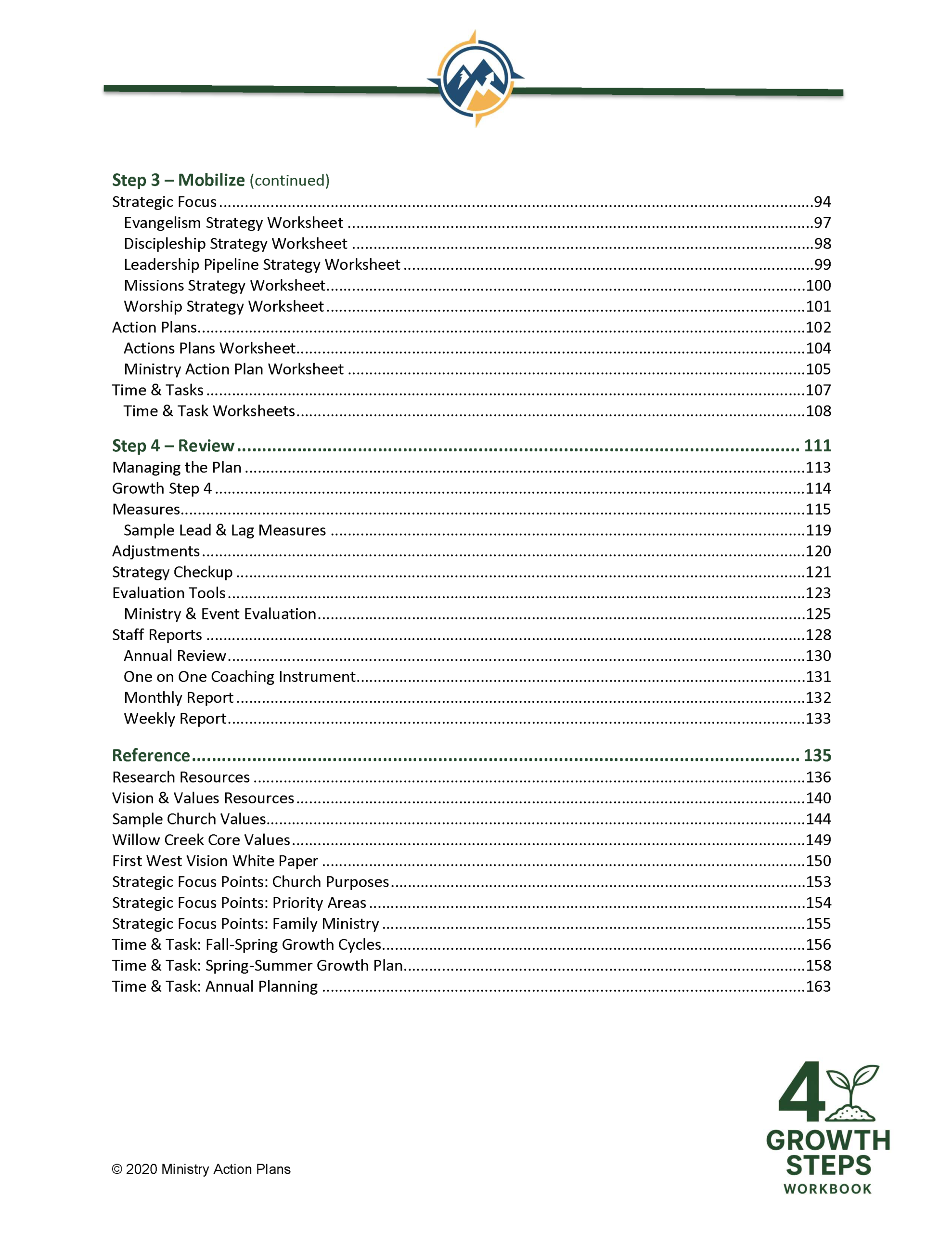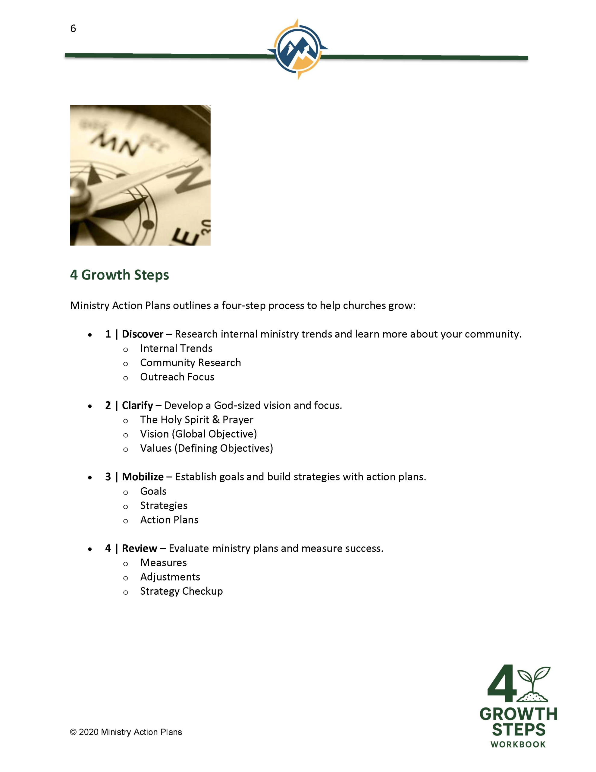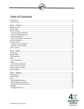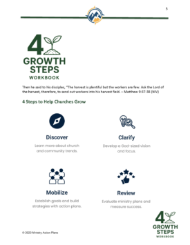 The 4 Growth Steps Workbook introduces a purposeful action plan to help grow your church. This comprehensive 164-page workbook is arranged in four sections that lead you to: